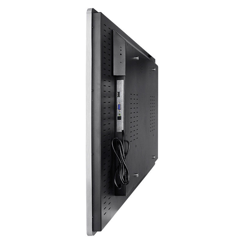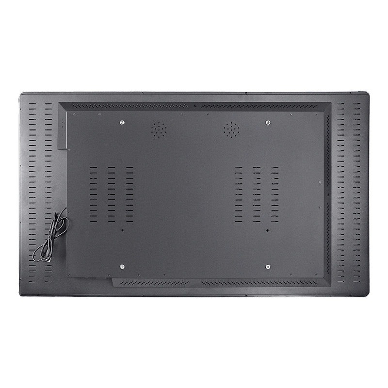 La vue arrière met en évidence un boîtier métallique de qualité industrielle avec plusieurs fentes de ventilation, favorisant une dissipation de chaleur efficace pendant les longues heures de fonctionnement.Une surface de montage plate et une structure renforcée rendent l'écran adapté au montage murale ou à l'installation intégrée dans des kiosques et des armoires. La gestion intégrée des câbles et la conception solide du couvercle arrière aident à maintenir l'installation propre et sécurisée.simplifie la maintenance, et prend en charge des performances stables dans les applications d'utilisation continue.