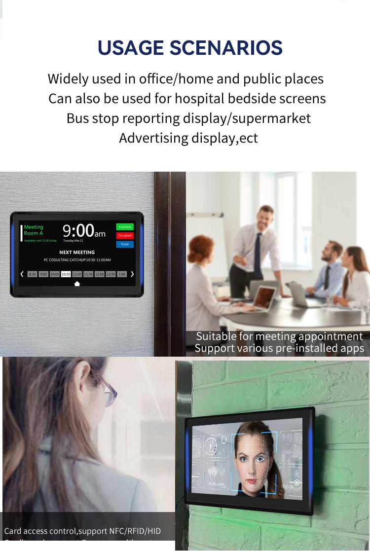 Cette tablette est non seulement idéale pour la réservation de salles de conférence, mais elle fonctionne également parfaitement comme un lecteur d'affichage numérique, un terminal de contrôle d'accès intelligent ou un kiosque interactif dans les immeubles de bureaux, les hôtels, les hôpitaux et les établissements d'enseignement. Pour les intégrateurs et les distributeurs, elle offre une solution polyvalente qui répond aux multiples exigences des projets avec une seule plateforme matérielle.