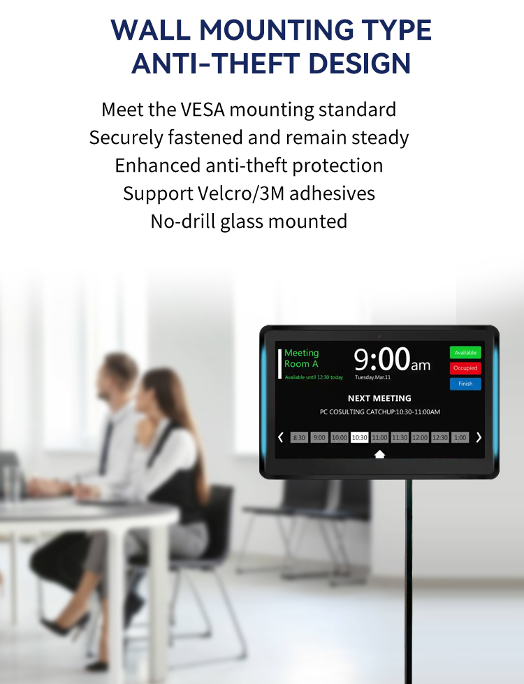 Alimentée par Android 12 OS et RK3566 CPU, cette tablette PC Android de 15,6 pouces offre des performances d'application fluides et une intégration flexible avec les logiciels de réunion populaires tels que Microsoft Teams, Zoom Room Display ou les systèmes de réservation personnalisés. Avec la prise en charge de la connectivité Wi-Fi, Ethernet et Bluetooth, elle peut facilement se synchroniser avec les calendriers, les plateformes de réservation ou les systèmes de gestion centralisés.